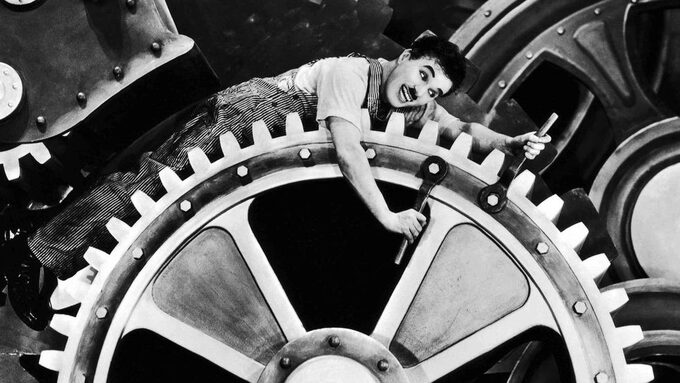 Charlot est ouvrier dans une immense usine. Il resserre quotidiennement des boulons. Mais les machines, le travail à la chaîne le rendent malade, il abandonne son poste et recueille une orpheline…